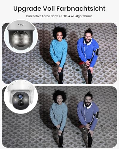 【 Ultra HD 2K Auflösung + Farb-Nachtsicht】 Erleben Sie atemberaubende 2K-Bildqualität (3MP, 2304×1296), die jedes Detail präzise einfängt. aosu überwachungskamera aussen wlan mit vier verbesserten LEDs für noch hellere und klarere Farb-Nachtsicht sorgt diese outdoor kamera kabellos rund um die Uhr für Sicherheit, Tag und Nacht.