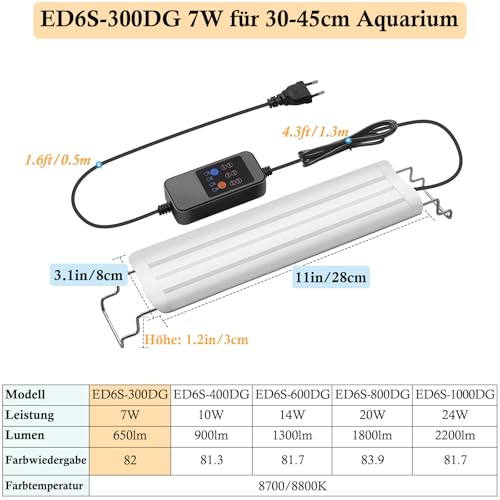 Vollspektrum Aquarium Licht, Ideal für Pflanzenwachstum: Dieses Vollspektrum Beleuchtung deckt blaues Licht (440-490nm), grünes Licht (520-570nm) und rotes Licht (610-670nm) ab, mit einer Reinheit von bis zu 95%, was sich positiv auf die Photosynthese von Wasserpflanzen auswirkt und das Wachstum von Wasserpflanzen wie Moos, Zwergperlenkraut usw. fördert. Die Lebensdauer dieser Pflanze Aquarium Lampe übersteigt 36.000 Stunden und eignet sich für den langfristigen Einsatz. Wir bieten für dieses Produkt einen 24-monatigen After-Sales-Service an.