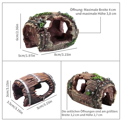 Realistisches Design: Das zerbrochene weinfass ist mit abgenutzter farbe, höhlen und moos verziert, was sehr realistisch aussieht und dem aquarium ein natürliches gefühl verleiht, wenn es darin platziert wird