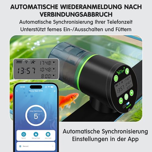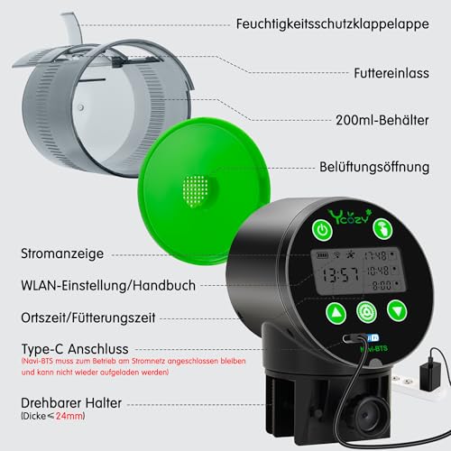 Ycozy WiFi Fischfutter Automat Aquarium, Futterautomat Netzteil mit EU-Stecker & USB-C Kabel Fischfutterspender WLAN Gesteuerter mit APP Automatischer Fischfutterautomat für Aquarium Navi-BTS
