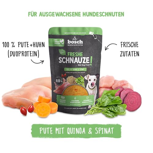 Bosch Freshe Schnauze, Pute mit Quinoa und Spinat 1 x 250 g, Schonend Dampfgegartes Nassfutter für Hunde, Vollwertiges Alleinfuttermittel mit hohem Fleischgehalt, 250 g Hundenassfutter