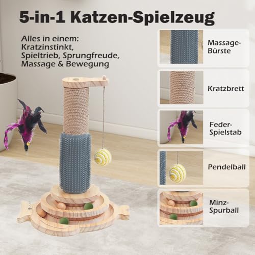 🐱【Multifunktionales Katzenspielzeug】Fünf Funktionen für ein Spielzeug: 1*Katzenkugelbahn-Spielzeug, 1*Katzenkratzbaum, 1*Katzen-Selbstpflege-Massagegerät, 1*Federspielzeug mit Saugnapf, 1*Hängespielball. →Mit diesem Spielzeug kann sich Ihre Katze gleichzeitig kratzen, massieren, spielen, springen und trainieren.