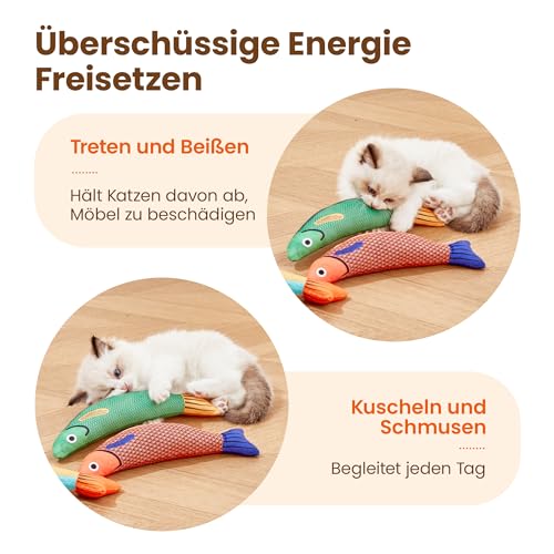 Perfektes Set – Das katzenspielzeug kommt im 3er set mit fischen in Grün, Gelb und Orange. Die hellen Farben ziehen die Aufmerksamkeit Ihrer katze an und machen das interaktiv spielen spannender.