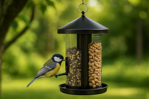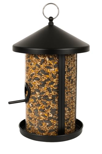 Mit seinem robusten schwarzen Design passt dieser Futterspender ideal zu modernen wie auch klassischen Gärten. Er wirkt hochwertig und zieht regelmäßig viele Vögel an.