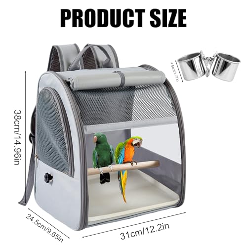 WIYETY Transportbox Transportbehälter für Vögel: Rucksack für Vögel mit Sitzstange und Edelstahl Tablett, Leichter Atmungsaktiver Transportbox, Haustier Reisekäfig für Papageien Sittiche (Grau, 33*17*26CM)