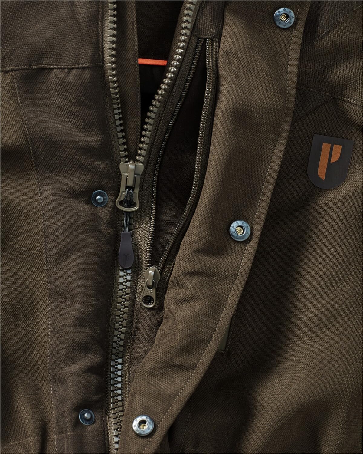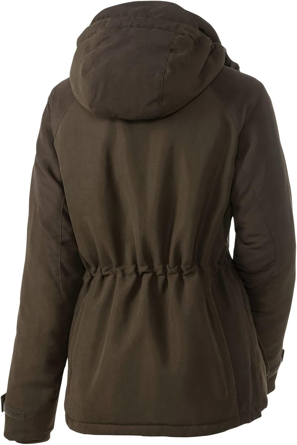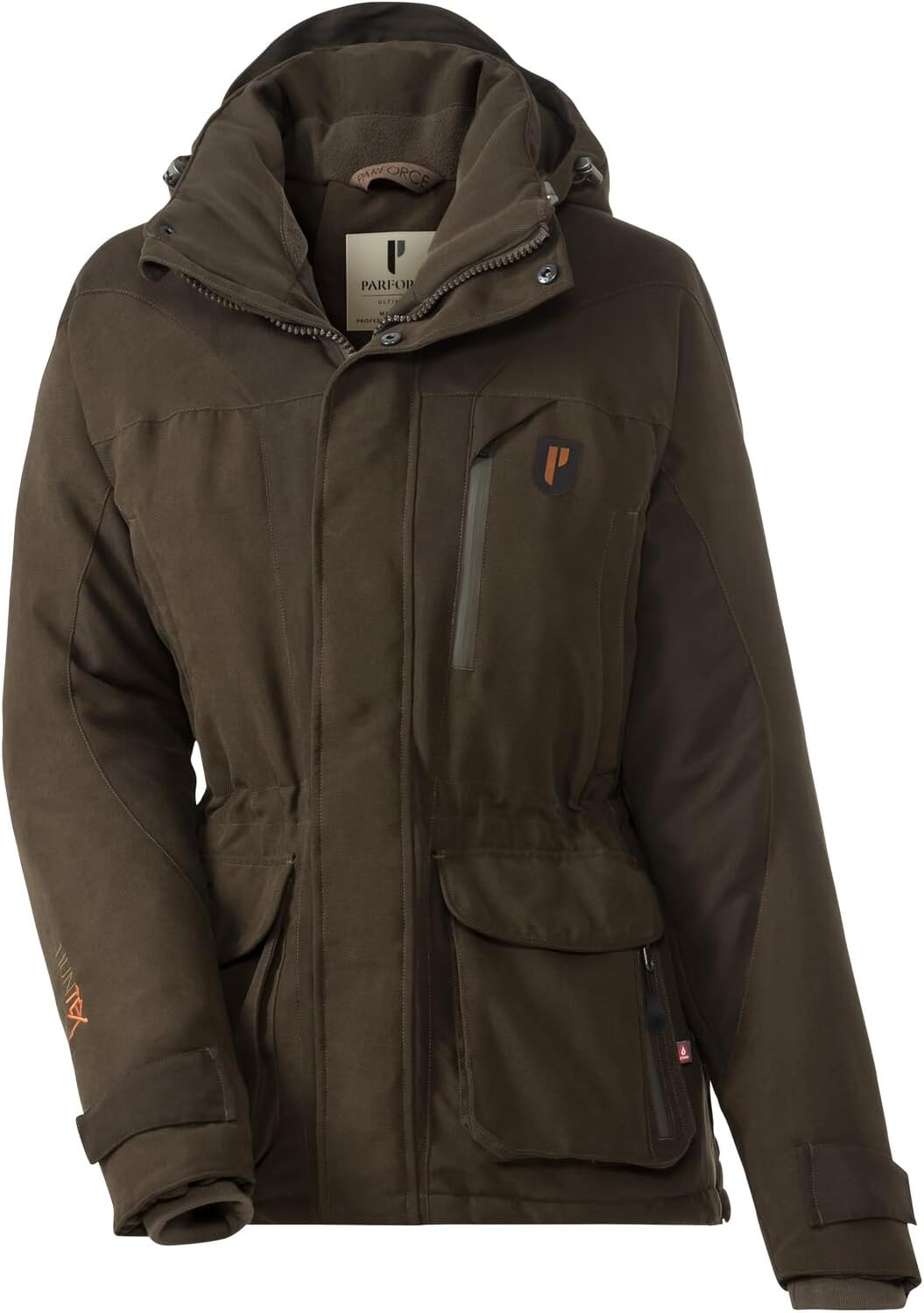 Warm women’s winter parka Ultimate Huntex by Parforce with excellent insulating PrimaLoft Silver padding (170 g/m² on the body / 133 g/m² on the sleeves) for winter seats in extreme cold (temperature range +10 to -32°C). The quiet, robust outer material is equipped with a waterproof, windproof, breathable Huntex membrane and taped seams. In addition, a water-repellent finish allows raindrops to bead off. The sophisticated features make the jacket an indispensable companion for winter hunting. So the padded hood is removable and adjustable with a drawstring. The robust 2-way zip is equipped with storm flap and chin guard. Inner knitted cuffs on the adjustable cuffs prevent draughts from entering. Ventilation zips with mesh insert under the arms allow for comfortable air circulation in case of heat build-up. Buttoned side slits provide freedom of movement and comfortable wearing comfort even when sitting. The waist can be individually adjusted with a drawstring. The bag features are particularly functional: 2 softly lined handwarmer pockets with zip, mobile phone/radio pocket on the left chest, Napoleon pocket on the left under the wind protection flap, 2 zipped inner pockets, 2 spacious front flap pockets with integrated ammunition holders, drainage eyelets and additional zip pockets as well as rabbit pocket with zips on both sides.
