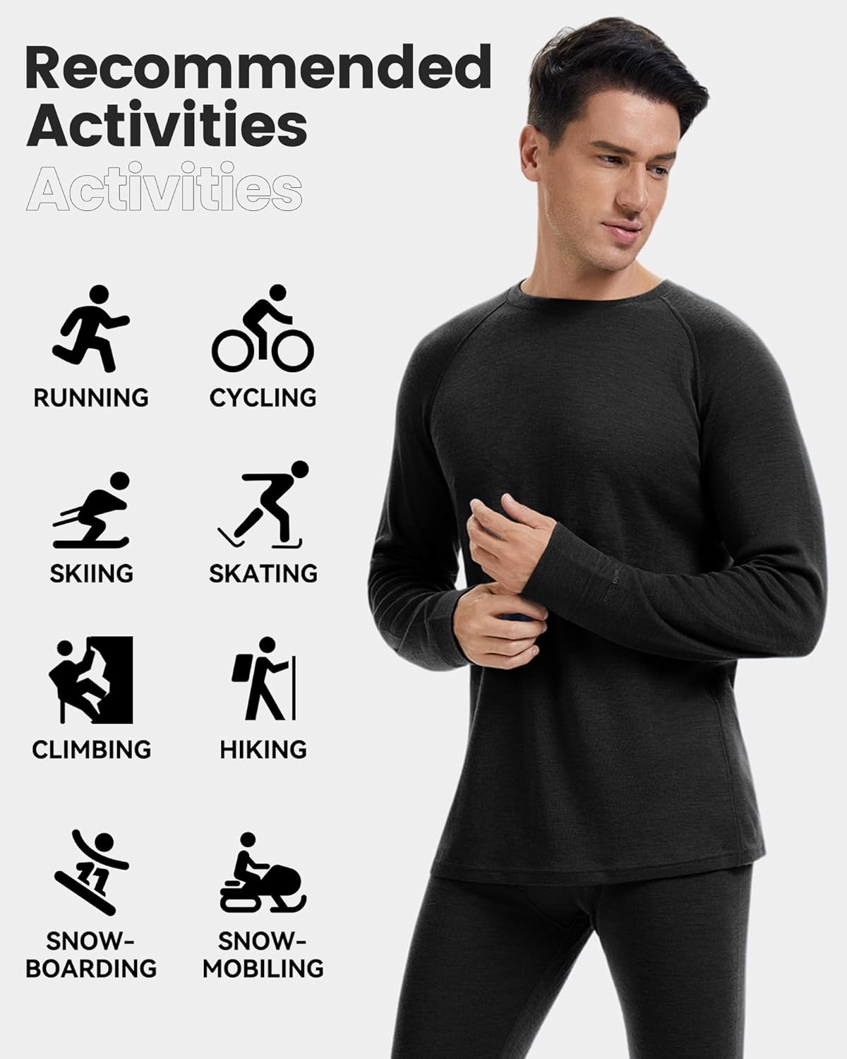 Men’s Thermal Top, 100% Merino Wool, Warm & Breathable Long Sleeve Shirt, Base Layer for Winter and Outdoor Use