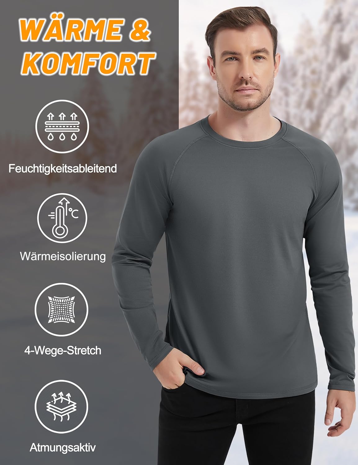 Der Text lautet „THERMO UNTERWÄSCHE“. Produktdisplay mit mehreren Ansichten von Thermounterwäsche oder Baselayer-Kleidung in verschiedenen dunklen Farben.