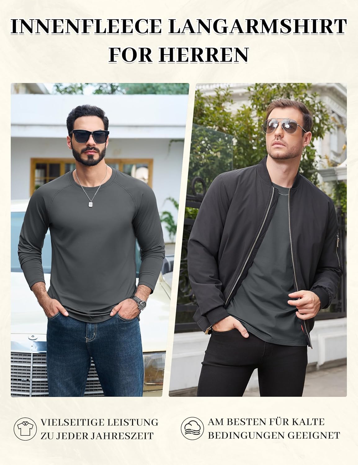 Produktbeschreibung TACVASEN Innenfleece Sport Atmungsaktives Langarmshirt Der Text lautet „LEICHTER INNERFLEECE LANGARM SHIRT FÜR HERREN“. Mehrere Produktbilder zeigen schwarze Langarm-Sportshirts an den Modellen, die das Design der thermischen Sportbekleidung hervorheben.