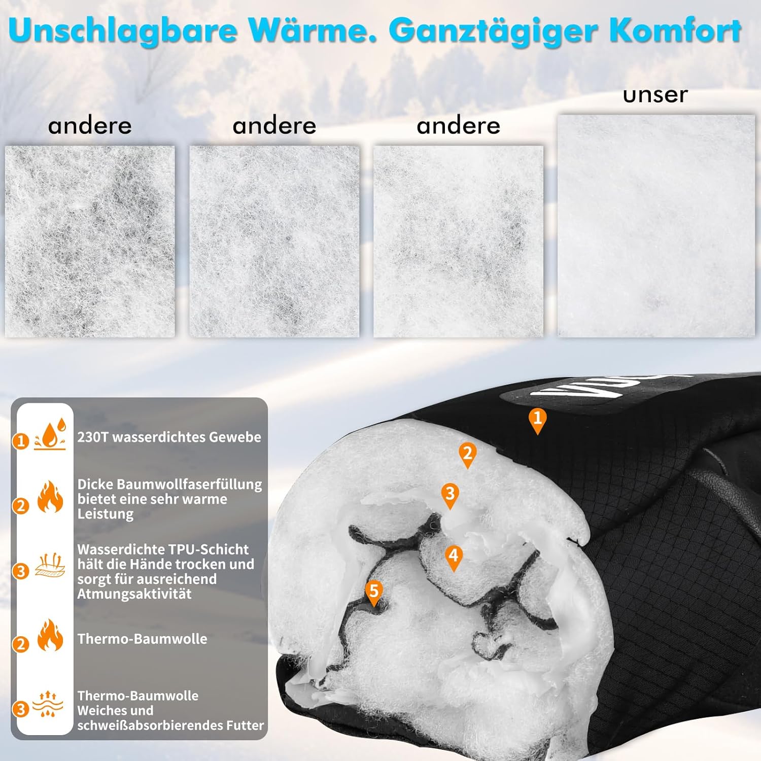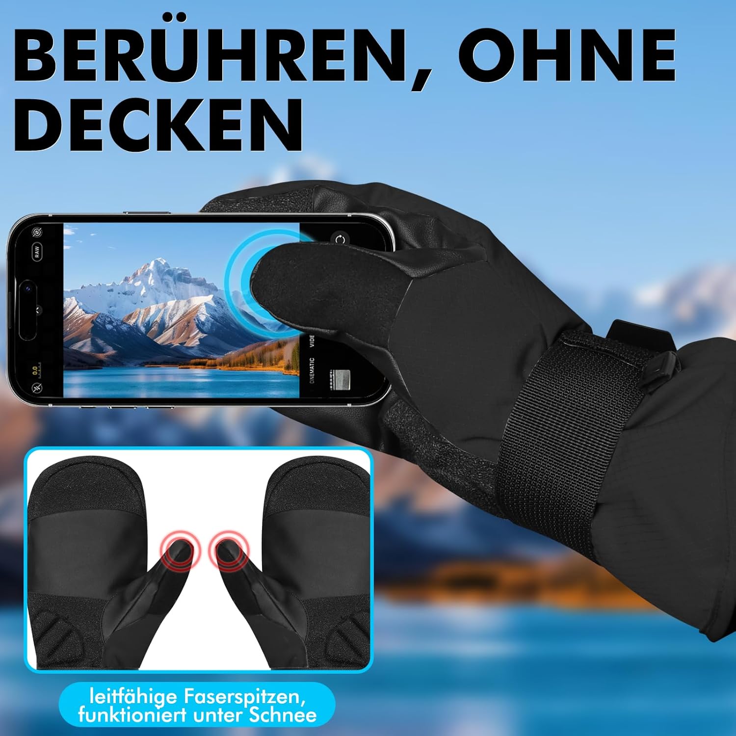 SCHNEEBESTÄNDIG UND WÄRMESPEICHER: Der verstellbare Schneesaum und die breite Manschette verhindern das Eindringen von Schnee, während das atmungsaktive Thermofutter für optimale Wärme sorgt, ohne zu überhitzen. Ideal als Skihandschuhe oder warme Winterhandschuhe.