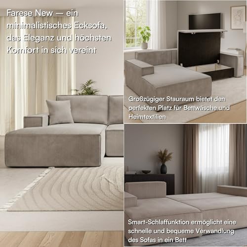 Erlebe die Vielseitigkeit der Farese Couch mit Bettkasten, die sowohl als gemütliche Sitzgelegenheit als auch als komfortables Schlafmöbel überzeugt.