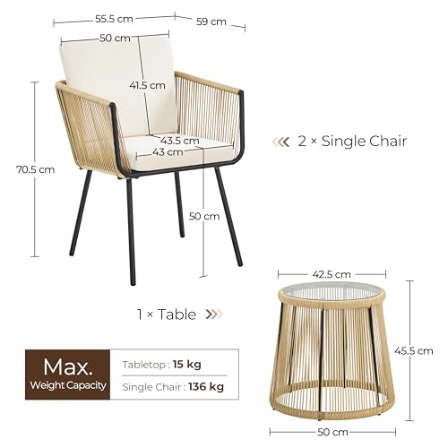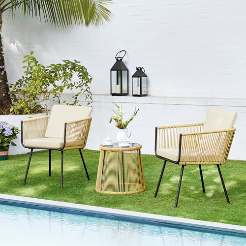 Yaheetech 3TLG. Rattan Balkonset, Gartenmöbel Set inkl. 2 Stühle mit 6cm Dick Sitz- und Rückenkissen & 1 Tisch mit 5mm Dick Hartglasplatte, Gartensitzgruppe für Balkon Outdoor, Hellbraun/Cremeweiß